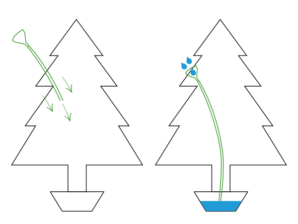 - Insert the flattened end of your WaterTree™ through the foliage from about waist height, near to the trunk, and down into the holding cylinder of the stand; push down as far as possible. It is advised that the WaterTree™ is inserted in an accessible position towards the rear of the tree so that whilst being easily usable it is also hidden from most views. The WaterTree™ can be placed at an angle of up to 30° from vertical if placing it vertically is not ideal – it is designed to bend if needed. Use the tie to secure the funnel mouth so that it’s not right next to any lights.